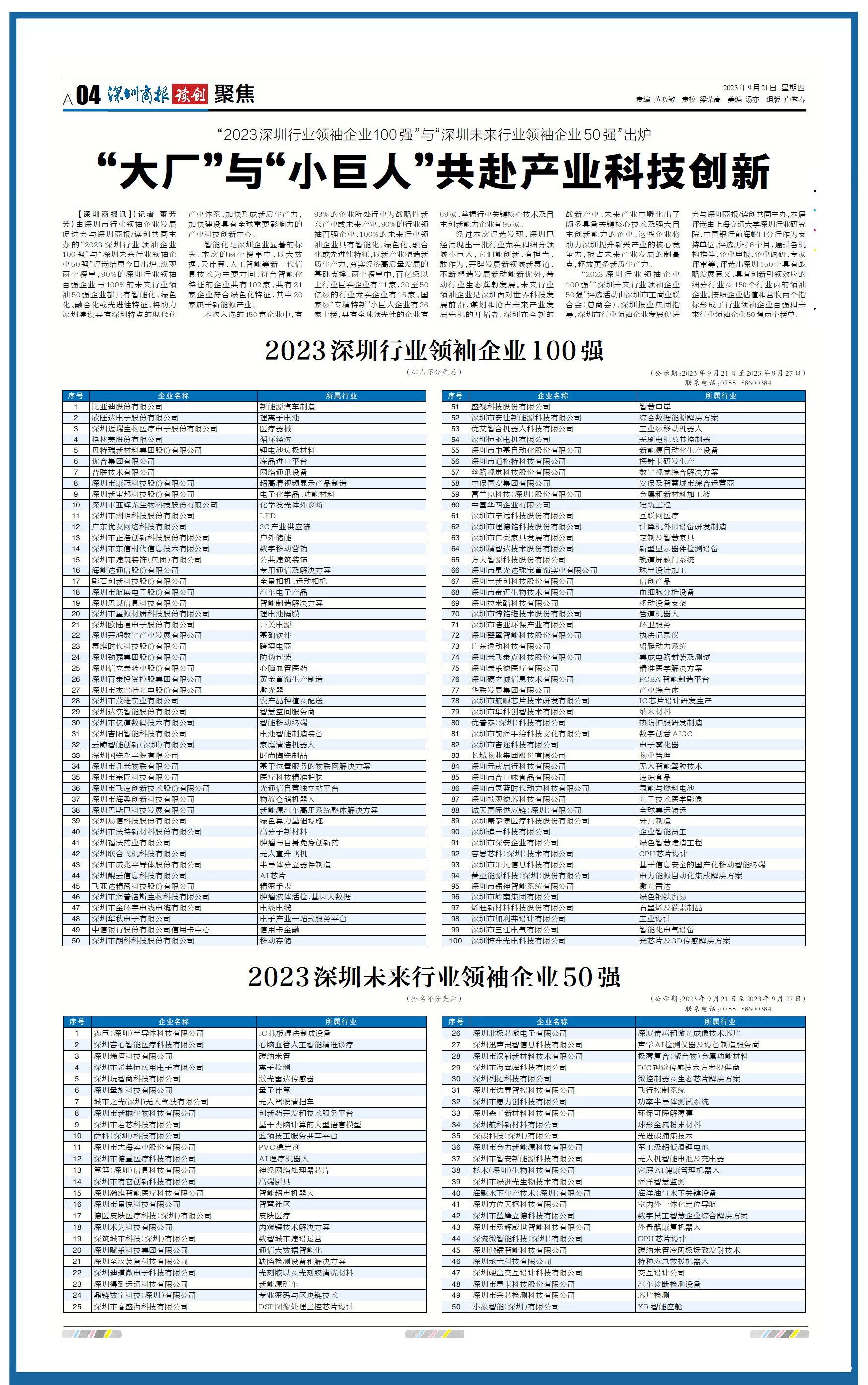 本次入選的(de)150家企業中,有93%的(de)企業所處行業爲戰略性新興産業或未來(lái)産業,90%的(de)行業領袖百強企業、100%的(de)未來(lái)行業領袖企業具有智能化(huà)、綠(lǜ)色化(huà)、融合化(huà)或先進性特征。兩個(gè)榜單中,百億級以上行業巨頭如:比亞迪、邁瑞生物(wù)等企業有11家,30至50億級的(de)行業龍頭企業有15家,國家級“專精特新”小巨人(rén)企業有36家上榜,具有全球領先性的(de)企業有69家,掌握行業關鍵核心技術及自主創新能力的(de)獨角獸企業如:睿心智能、烯灣科技等有95家。