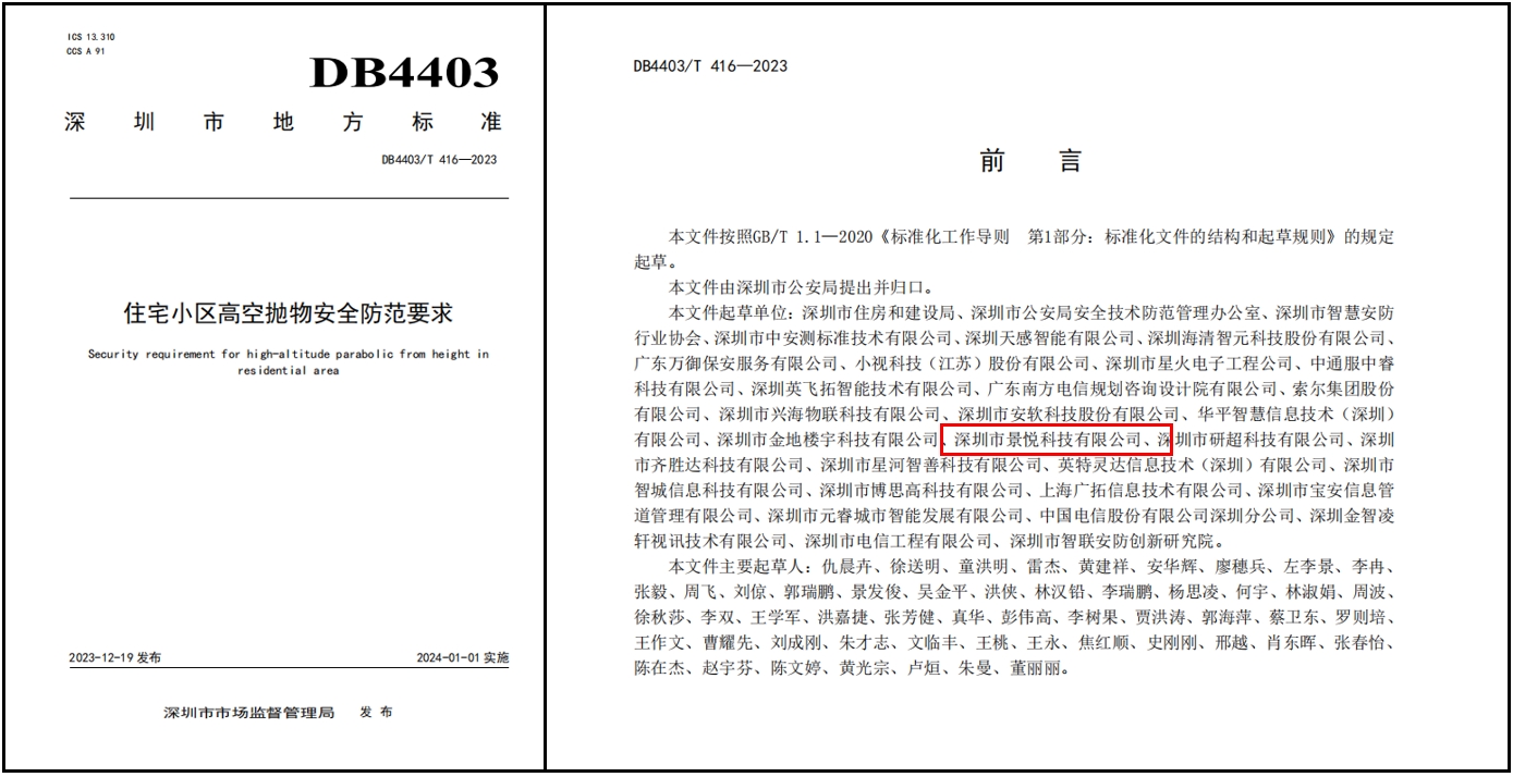 《住宅小區(qū)高(gāo)空抛物(wù)安全防範要求》編制工作于2021年5月(yuè)啓動,由深圳市公安局提出并歸口,其起草(cǎo)單位有深圳市住房(fáng)和(hé)建設局、深圳市公安局安全技術防範管理(lǐ)辦公室、深圳市智慧安防行業協會及多(duō)家行業代表企業多(duō)輪的(de)調研及討(tǎo)論,曆時(shí)兩年多(duō)終于正式對(duì)外發布。該文件規定了(le)住宅小區(qū)高(gāo)空抛物(wù)安全防範的(de)總體要求、重點區(qū)域和(hé)部位及其防護要求、人(rén)力防範要求、實體防範要求和(hé)電子防範要求,這(zhè)也(yě)代表了(le)景悅科技的(de)社區(qū)安防技術能力得(de)到了(le)政府及行業的(de)認可(kě)。